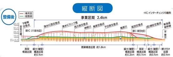 国道1号静清バイパス清水立体は、バイパスの起点に位置し、静岡市清水区横砂東町〜八坂西町を結ぶ延長2.4qを高架構造にする事業で、交通渋滞および交通安全、環境保全を目的とした事業です。